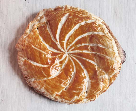 – Mark the top of the pastry from the centre to the edges like the spokes of a wheel or in a zig zag pattern with the tip of a knife, then brush with the whisked egg yolk. ::: Ein Muster (Rad oder Raute) in die Oberfläche des Kuchens mit einer Messerspitze einritzen. Mit Eigelb bestreichen.